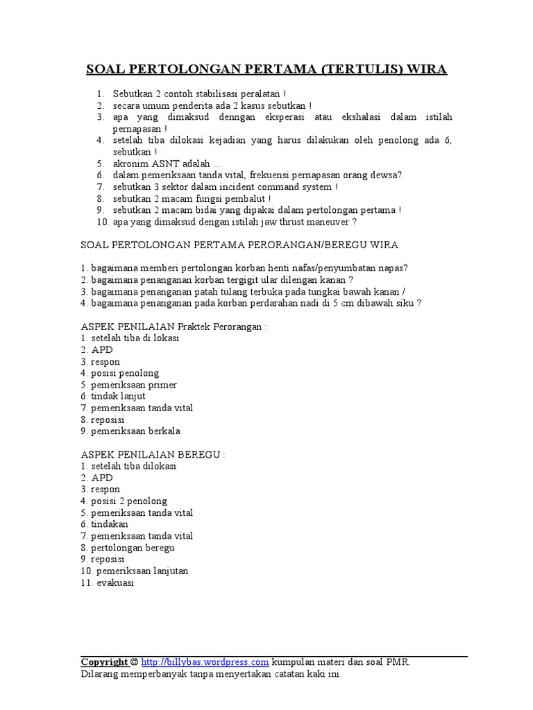 Contoh Soal Pertolongan Pertama Wira Beserta Jawabannya from imgv2-2-f.scribdassets.com Check spelling or type a new query. Contoh soal olimpiade pmr wira. We did not find results for: Maybe you would like to learn more about one of these?